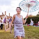 A young woman prepares to jump off a wooden pier into a clear blue lake, performs a backflip mid-air, and swims towards the shore. Two men are present on the pier, one of whom is recording the jump. More about Jaws Bridge →